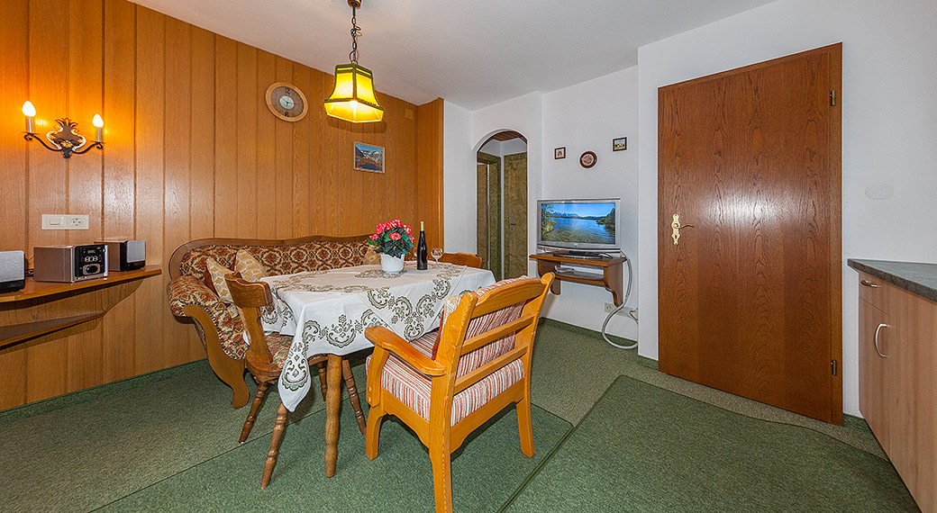 Im Wohnraum befinden sich außerdem eine gemütliche Essecke sowie eine große Ausziehcouch, die sich in ein Bett umwandeln läßt.
